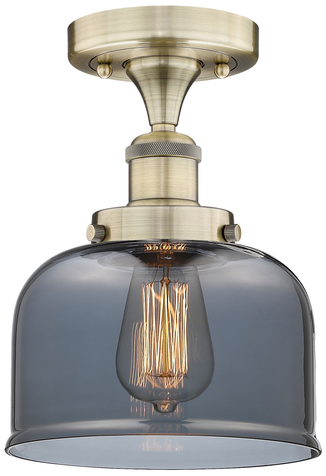 Bell 7.75"W Antique Brass Semi.Flush Mount With Plated Smoke Glass Sha