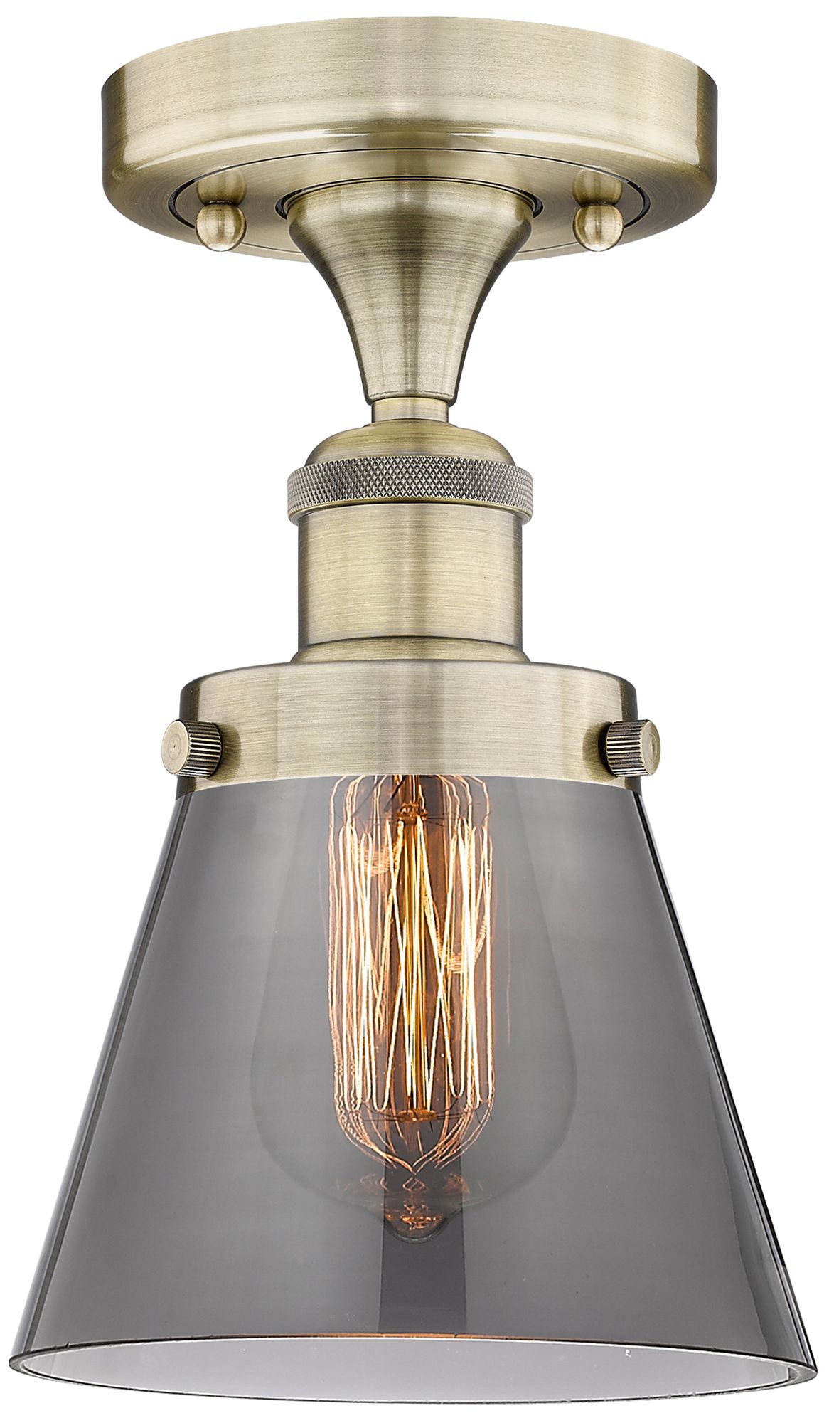 Cone 6.25"W Antique Brass Semi.Flush Mount With Plated Smoke Glass Sha