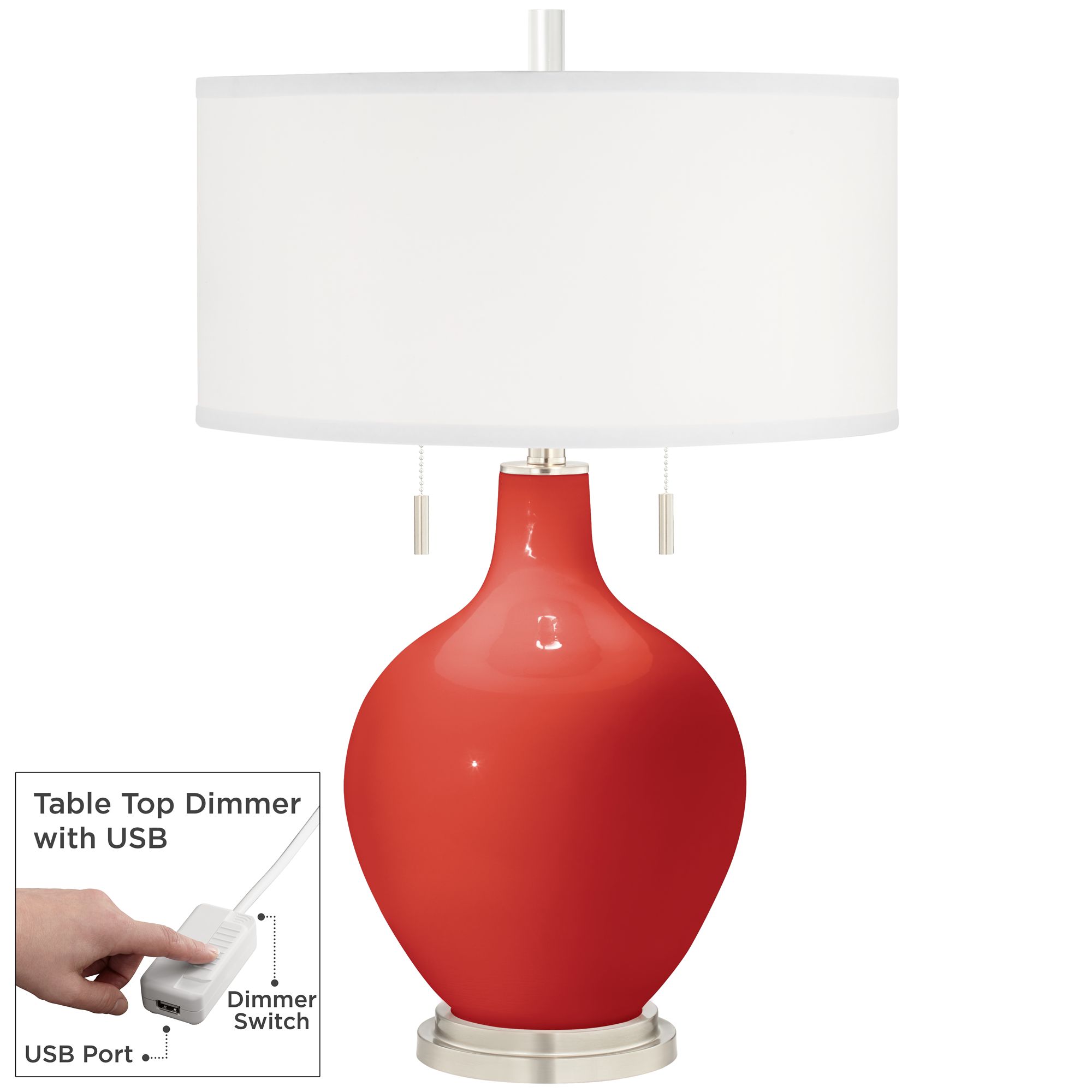 Bring exquisite style and designer color home with the Toby Color Plus™ table lamp in beautiful Cherry Tomato Red. The design is hand-crafted by experienced artisans in California, and is completed by a brushed nickel finish base and pull chains. A plain drum shade sits on top, drawing the look together in contemporary style. Tabletop dimmer included for added convenience. Lamp base U.S. Patent # 8,899,798.