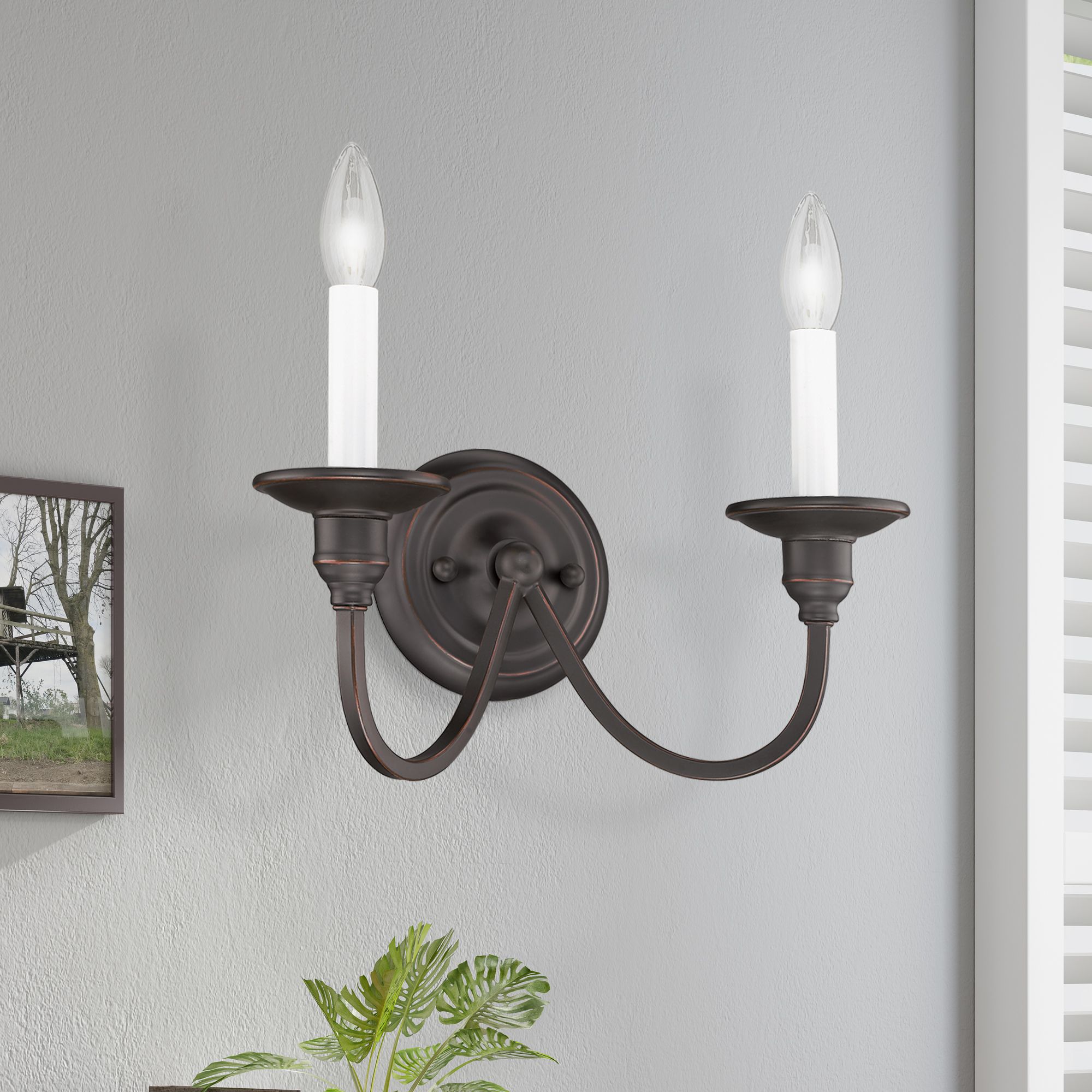 Classic candle silhouettes shine as this traditional metal two-light wall sconce brings refined heritage to the room.