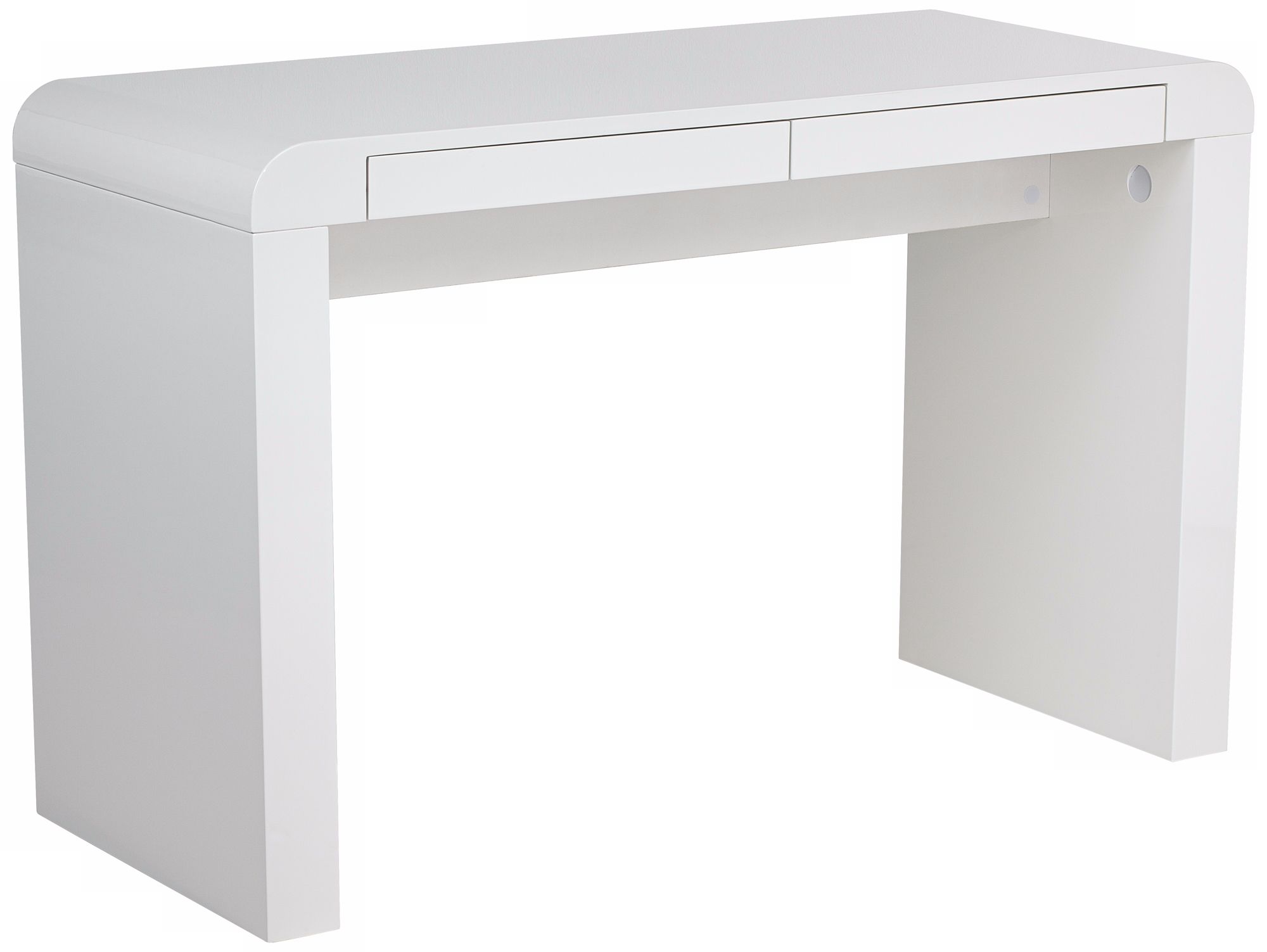 Smooth rounded edges combined with stark straight lines and a clean high-gloss white finish offer elegance in this contemporary desk design. It comes equipped with two drawers to store pens, pencils, and other task supply items.