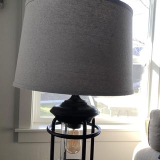 - Lantern style bases. Bronze finish metal construction. Clear glass around the night light. Oatmeal fabric shades. 8-foot long brown cords.