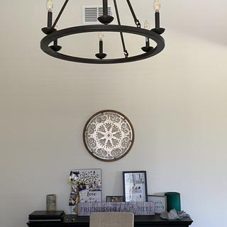 - Transitional six-light round chandelier by Franklin Iron Works™. Based on ring and wagon wheel designs.