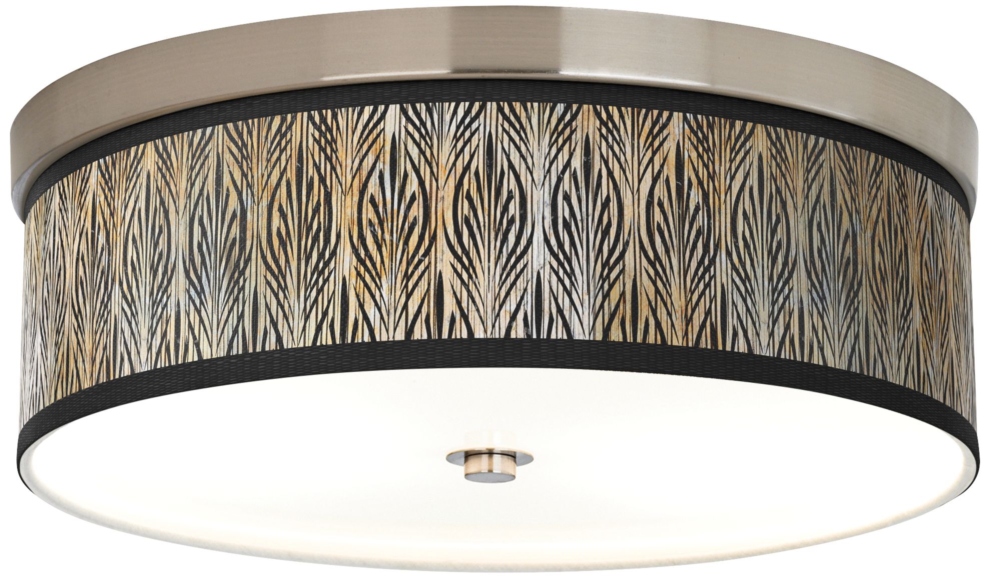 This energy-efficient flushmount ceiling light features a custom made-to-order giclee shade with an exclusive Amara printed pattern. An acrylic diffuser at the bottom prevents glare from the two included LED bulbs. The canopy and accents are in a brushed nickel finish. Shade printing process U.S. Patent # 7,347,593.