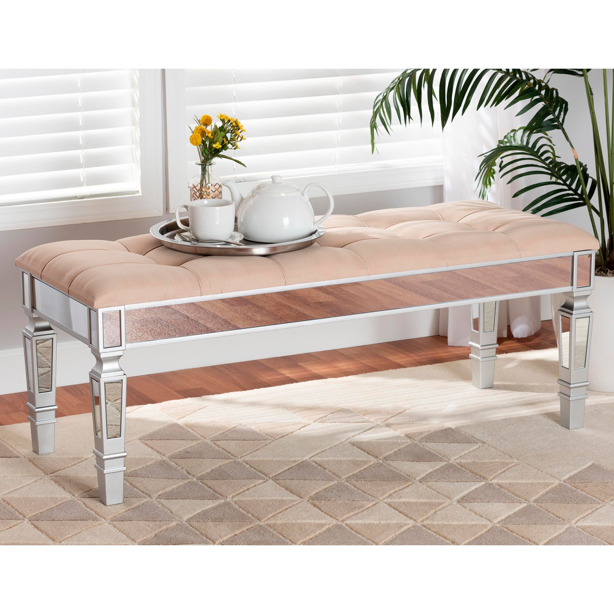 Make room for extra seating with modern glam style as this luxe tufted accent bench becomes a superb choice. Perfect for an upscale bedroom or living area, this bench from the Hedia collection by Baxton Studio is made of wood with a silver finish and mirrored glass accents. Tapered legs emphasize an Art Deco feature. Sit comfortably on a foam-padded cushion covered in beige velvet and detailed with hand-crafted button tufting.