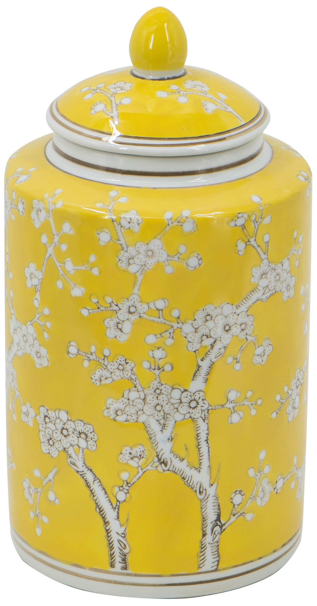 13.5" High Yellow and White Plum Blossom Lidded Jar