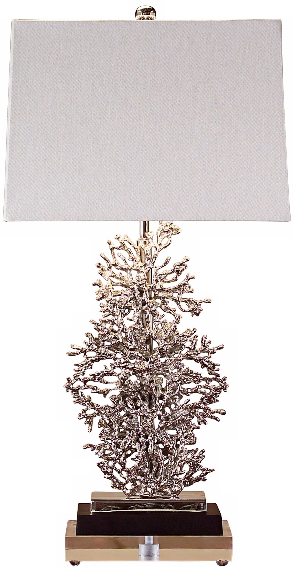 Coastal style has never looked like this. Silver plated coral forms the base of this table lamp from John Richard. Coral creates wonderful visual texture and silver catches the light in a variety of ways. Clean rectangular linen shade and square base provide great contrast to the textures of the coral.