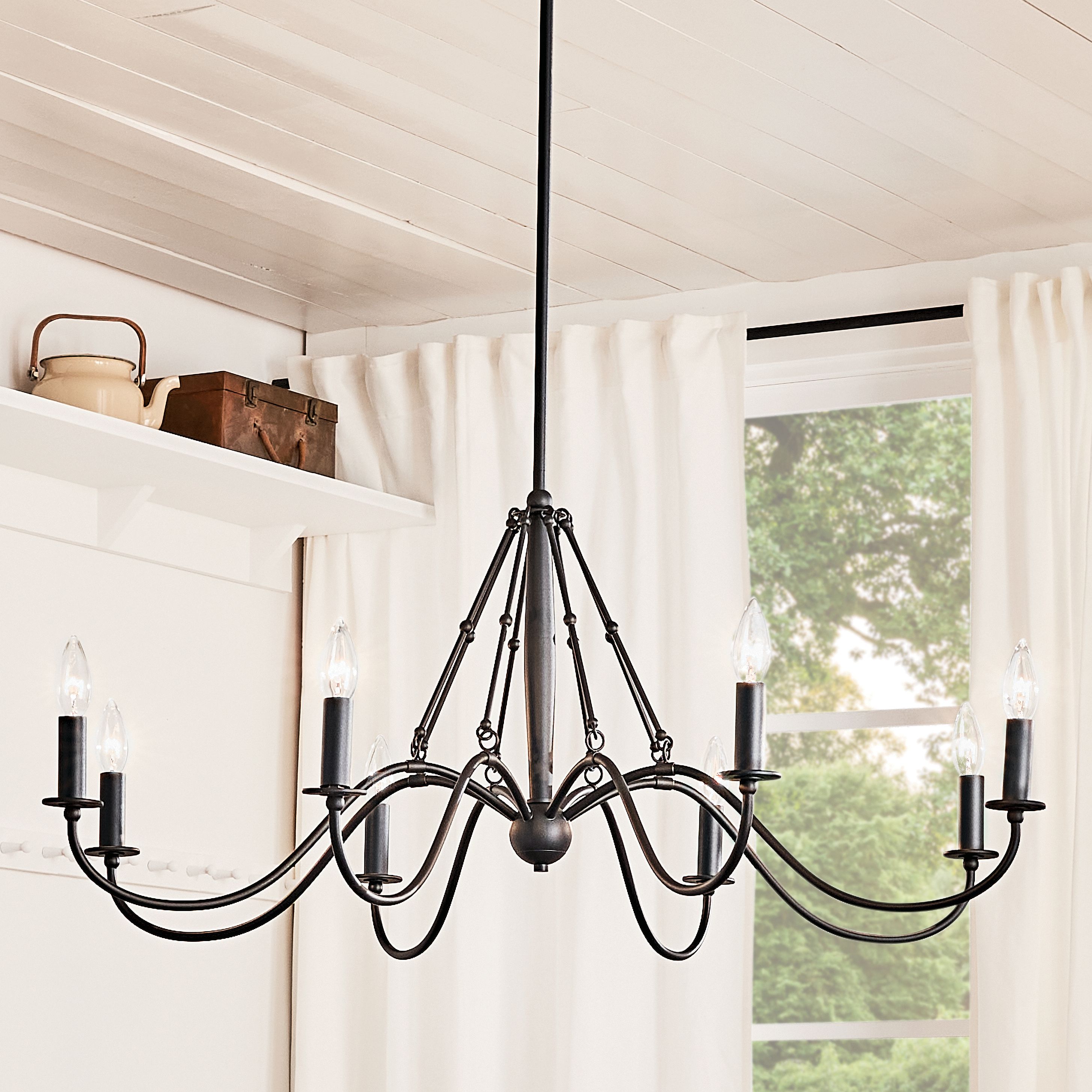 Sweeping arms cradle candle-like lights in this traditional eight-light chandelier, its textured black finish over steel has a regal feel.