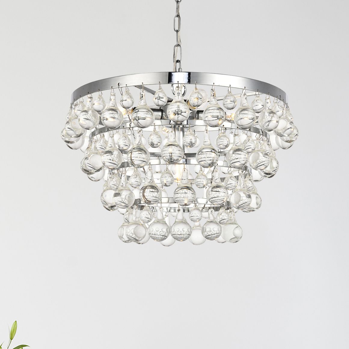 - Chrome finish over iron frame. Clear crystal drops.