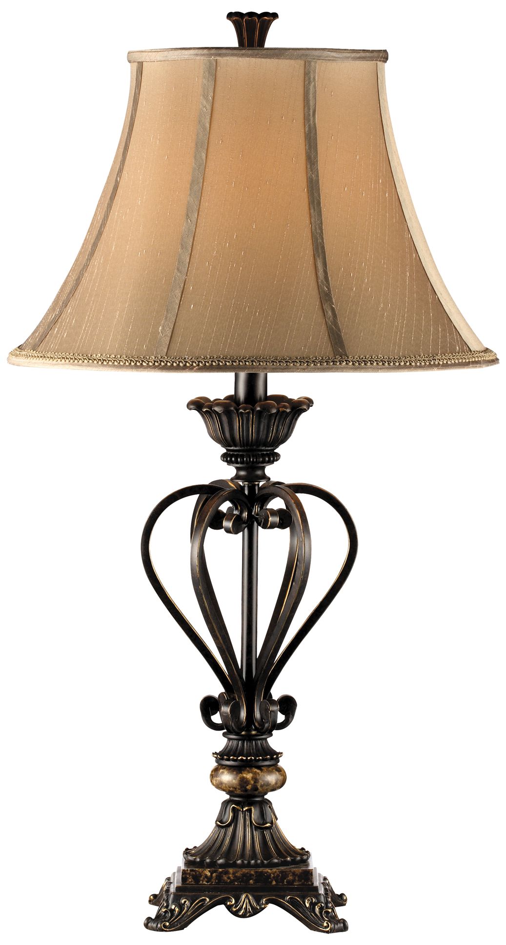 Traditional beauty is personified in this stunning table lamp from the Lyon collection. The beige faux silk softback bell shade encases the energy-efficient LED construction. A French bronze finish coats the scrolling ironwork design of its iron base completing the timeless aesthetic.