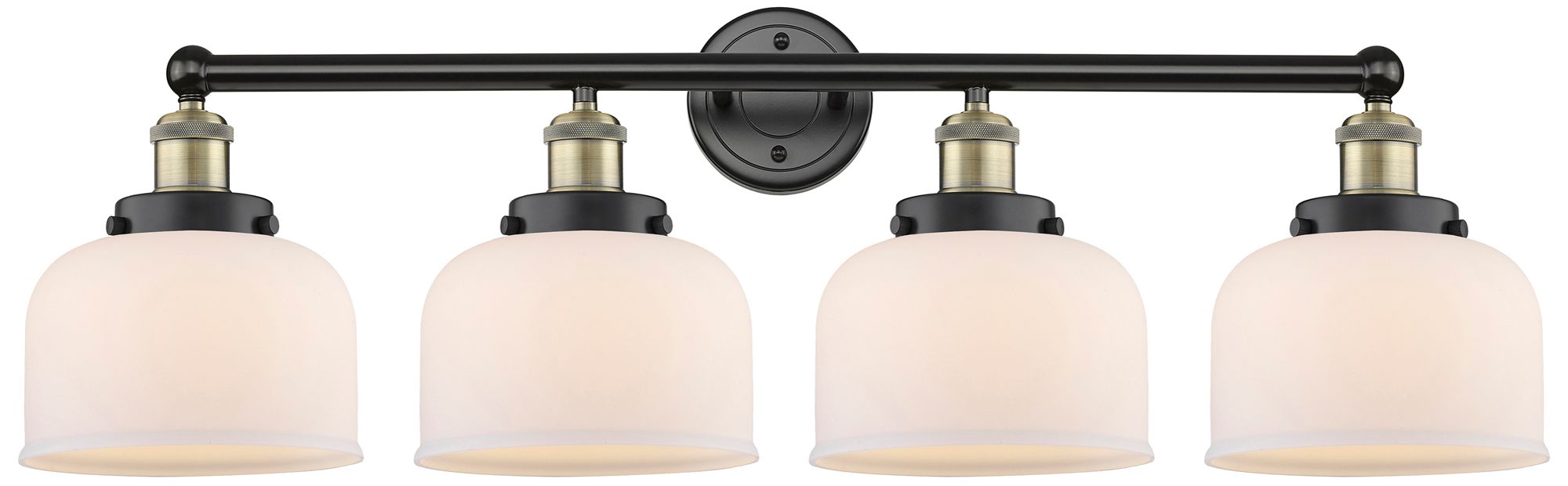 Large Bell 33.5"W 4 Light Black Brass Bath Light w/ Matte White Shade