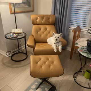 Lean back and relax in the luxuriating comfort provided by the Melia recliner and matching ottoman, from the BenchMaster brand. The cognac tan color tufted faux leather seat and back allows you to enjoy this minimalist addition to your living space. The seat allows for both a 360 degree swivel and generous recline, letting you put your feet up on the slanted ottoman. The perfect addition to your home.
