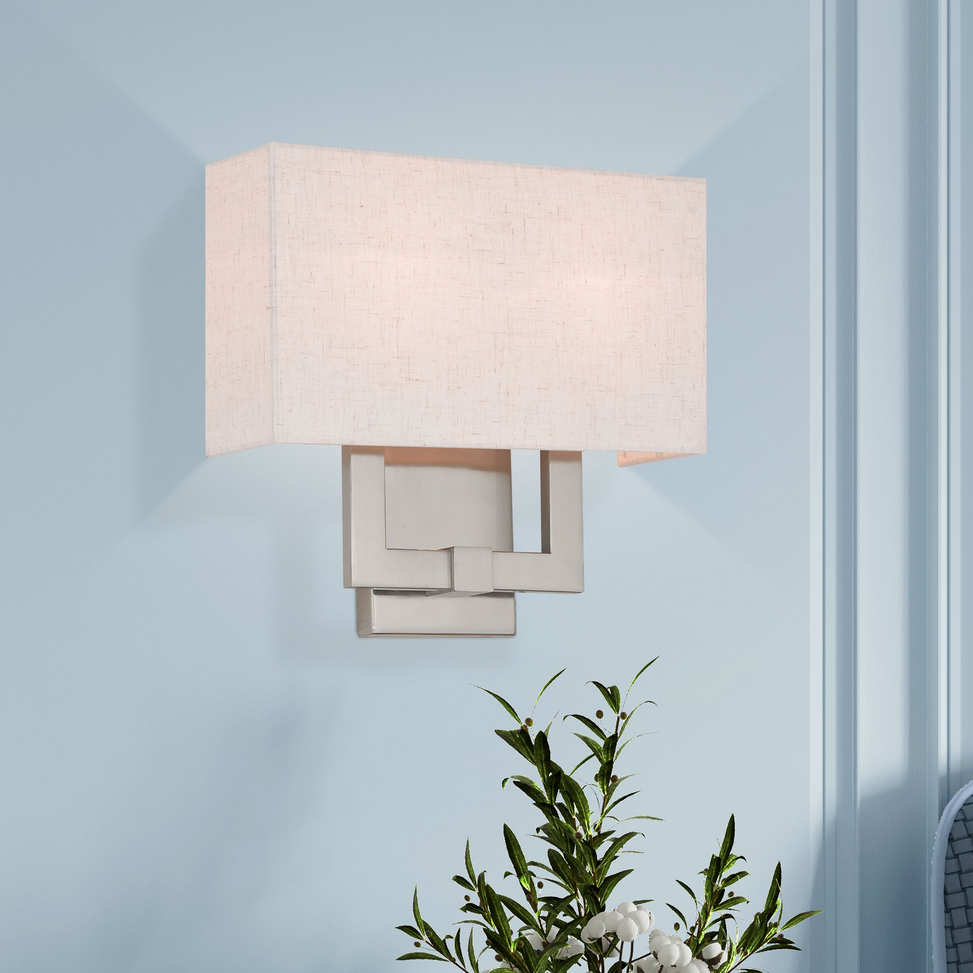 Sleek, stylish, and effortlessly modern, the Meridian wall sconce features a brushed nickel finish and a hand-crafted oatmeal fabric hardback shade.