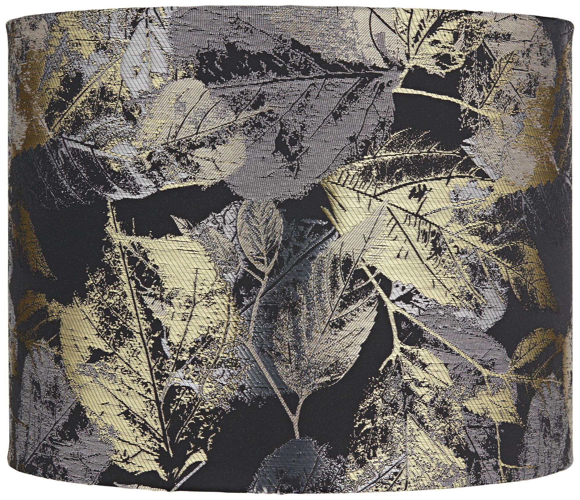 The beauty and intricate design of leaves in nature is captured on this gold and silver lead drum lamp shade. Various-sized leaves stand out against the linen exterior. This piece is crafted with a hardback shade and satin silver lining.