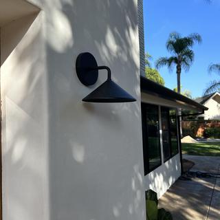Embrace the simple yet dramatic design of this industrial-style LED outdoor wall light. This light from the City Streets collection by Minka Lavery makes a bold statement with a geometric silhouette joining a rounded mount with a conical shade. Fashioned from sand coal finish aluminum and steel, it features dimmable options with the separate purchase of an electronic low voltage or LED rated dimmer. Enjoy an energy-efficient lighting with a classic village look.