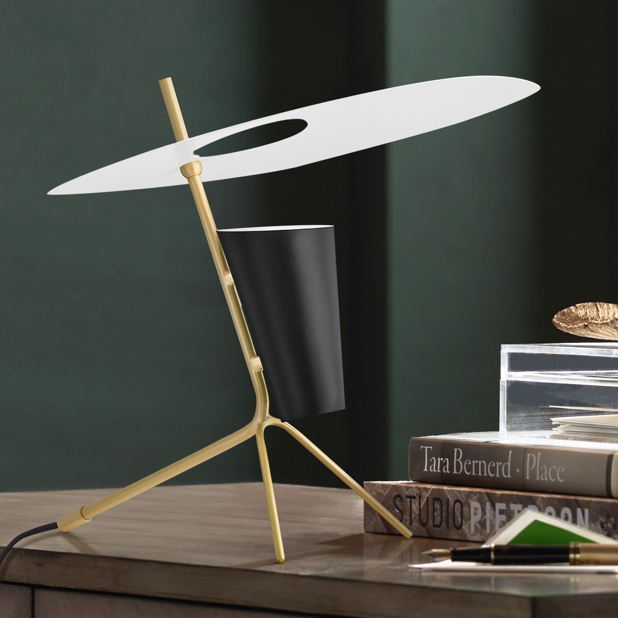 - Aged brass finish over metal frame. White steel accent shade. Upturned black cone shade.