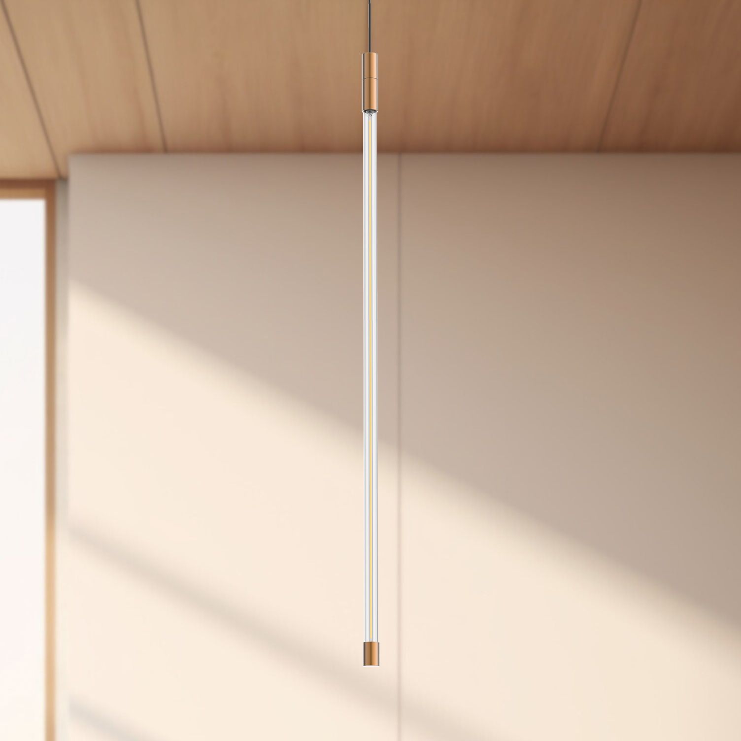 A slim brushed-gold stem suspends this Mid-Century Modern LED mini pendant, its clear cylinder shimmering with filament art.