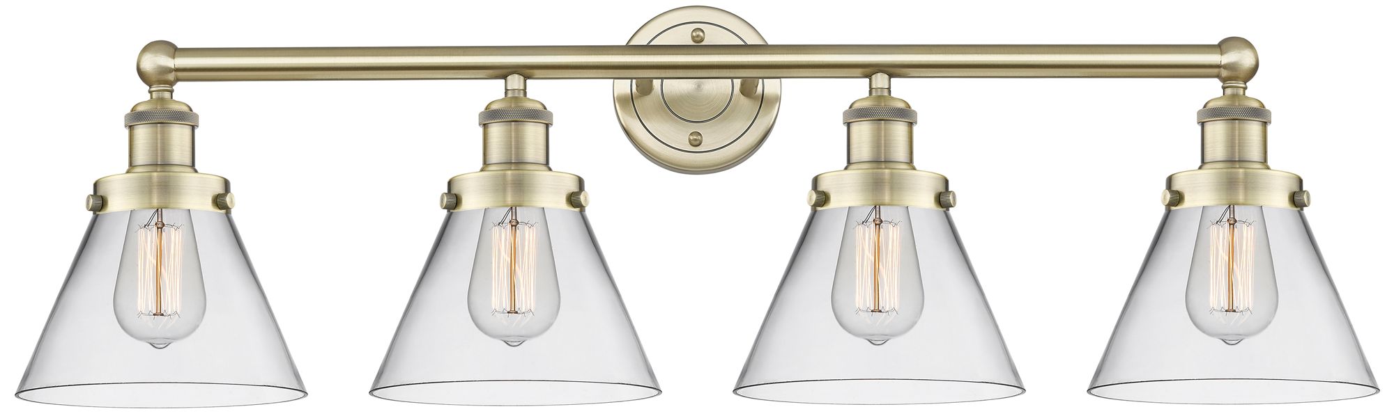 Large Cone 34.75"W 4 Light Antique Brass Bath Vanity Light With Clear