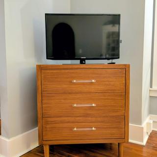 - Brushed teak finish. Top and side panels are MDF construction. Outside frame and legs are solid wood construction. Crystal handles.