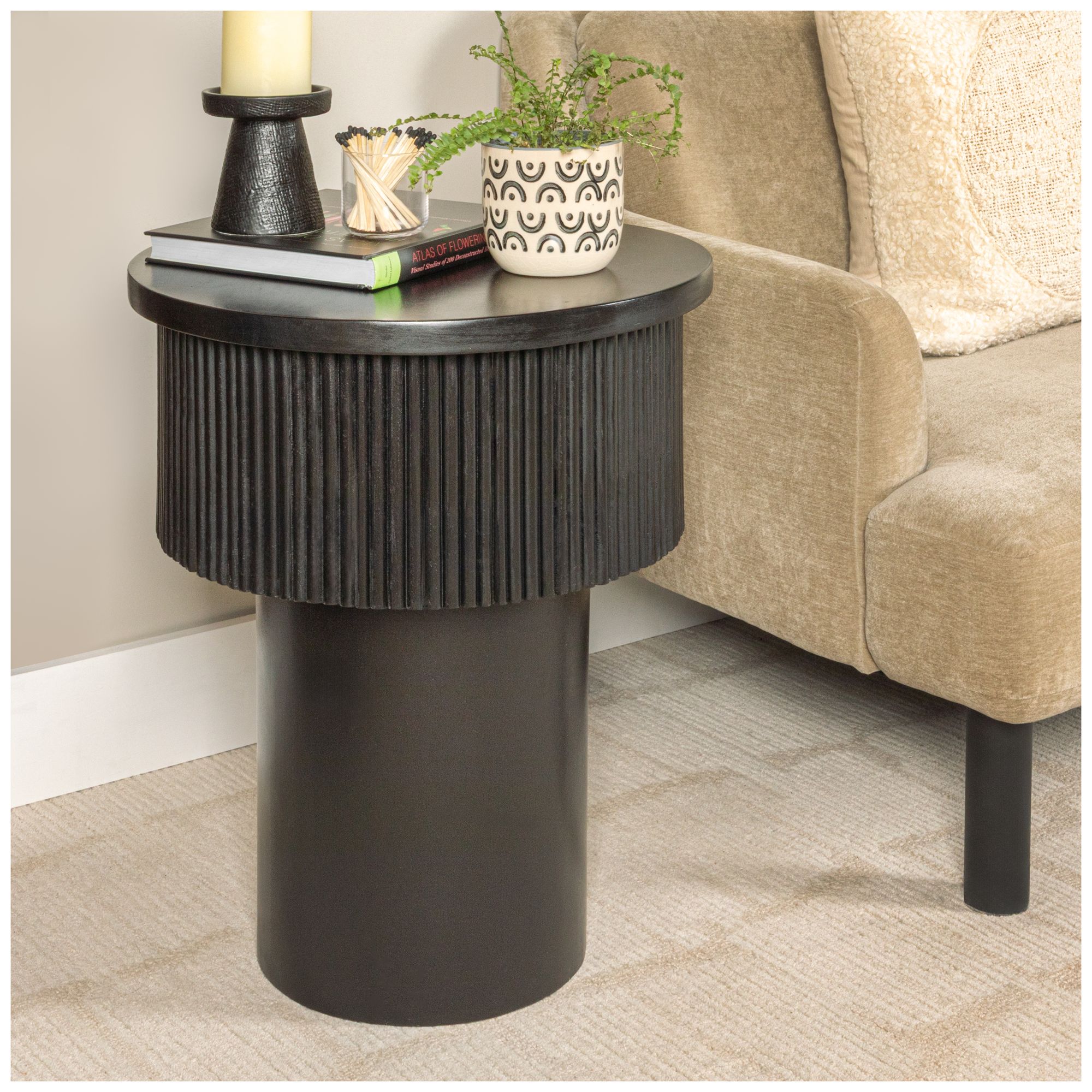 Round Fluted Tiered Mango Wood End Table, Black Finish