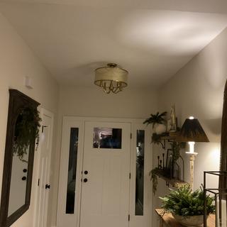 - Warm antique brass finish. Soft gold toned organza drum shade.