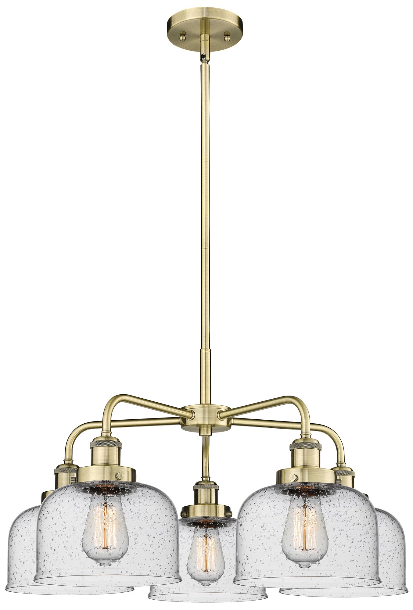 Bell 26"W 5 Light Antique Brass Stem Hung Chandelier With Seedy Glass