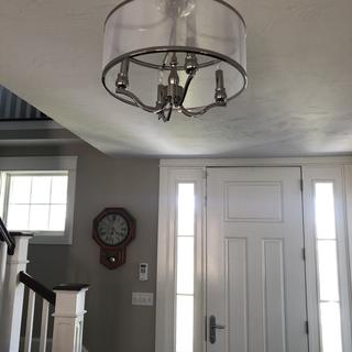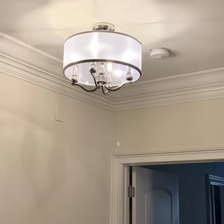 This semi-flushmount ceiling light features a polished nickel finish that gleams beautifully when the light is turned on.