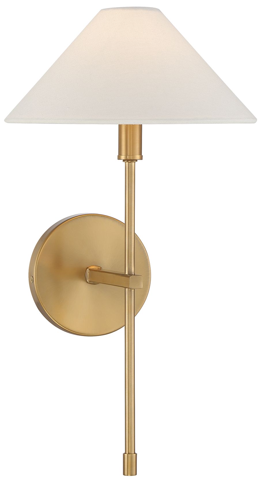 Light up your home with the thoughtful style of the contemporary metal wall sconce from Savoy House. A tapered white linen shade sits atop a cleanly defined and slender arm mounted to a round backplate. The light's warm brass finish brings brightness and warmth.