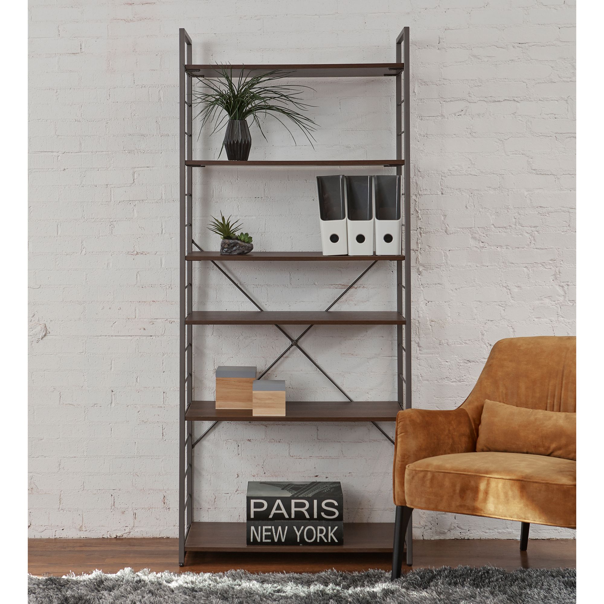 Tangent 33" Wide Cocoa Wood Silver Metal 6-Shelf Bookcase