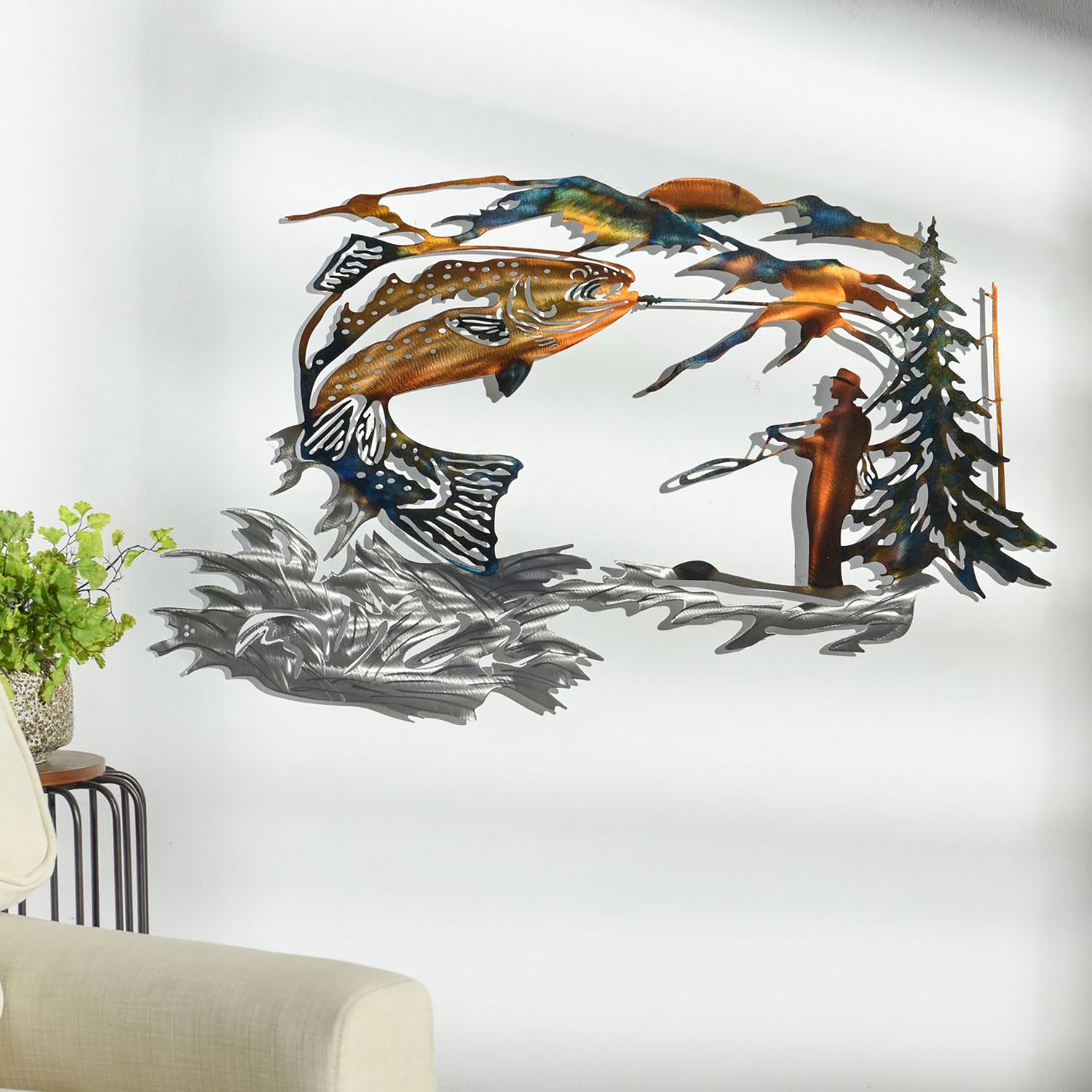 Fishing 39" Wide Laser-Cut Heat-Colored Metal Wall Decor