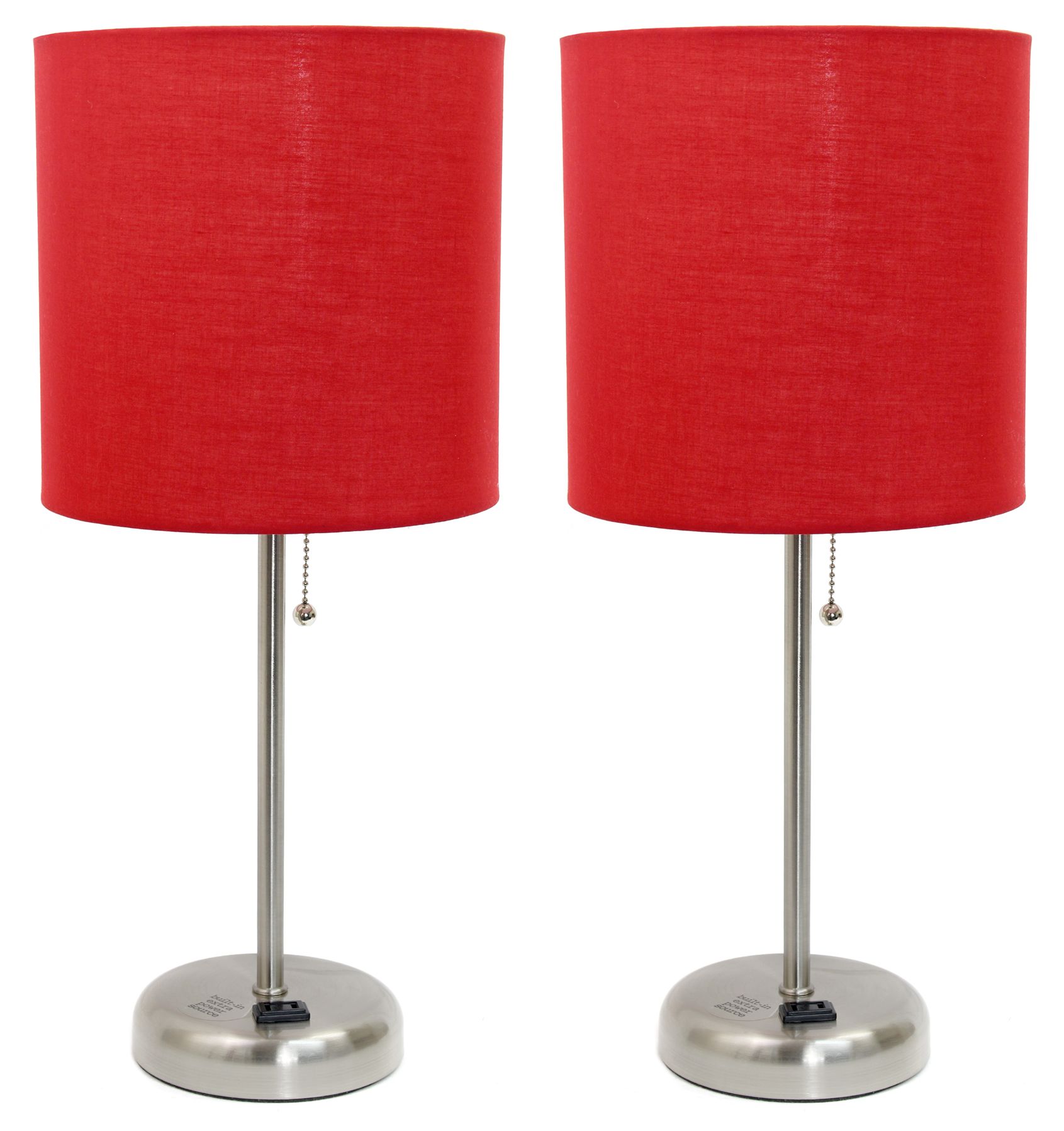 19.5" Brushed Steel Table Lamp Two Pack Set with Power Outlet, Red Sha