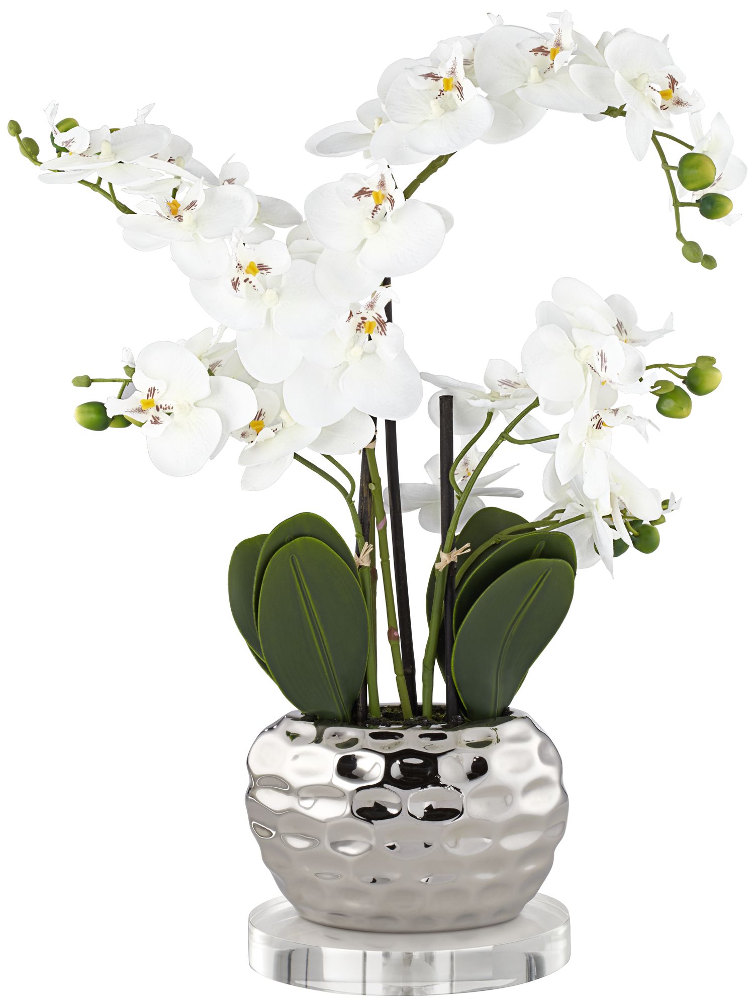 White Phalaenopsis 23" High Faux Orchid Flower in Silver Resin Pot